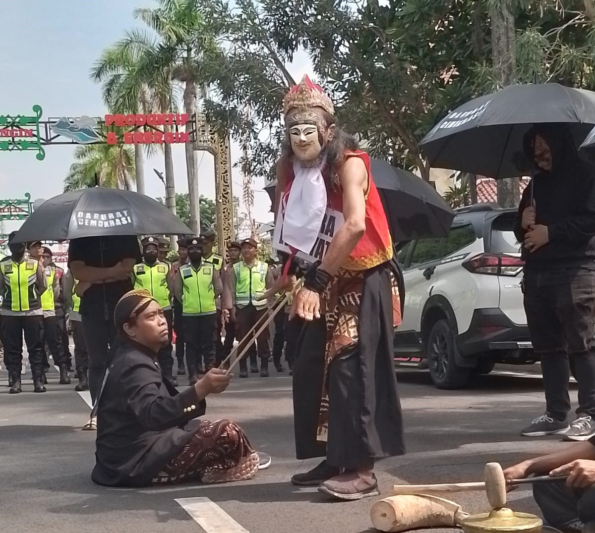 Sekitar 25 peserta aksi melakukan, melakukan aksi teaterikal berseragam baju hitam-hitam, tanda berkabung. Selain itu, pun mahasiswa terlibat membawa 10 payung hitam bertulis : “Darurat Demokrasi”.