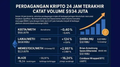 VISI.NEWS | BANDUNG – Dalam 24 jam terakhir, aktivitas perdagangan kripto di berbagai jaringan blockchain mencatat lonjakan signifikan. Berdasarkan data dari Dexscreener, total volume transaksi mencapai \$934,1 juta dengan lebih dari 2,47 juta transaksi terjadi di berbagai platform decentralized exchange (DEX). Peringkat pertama dalam volume transaksi dipegang oleh pasangan Keeta/WETH