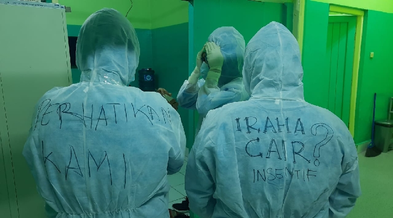 Para petugas mencurahkan dengan tulisan di baju hazmat atau baju alat pelindung diri (APD) menggunakan spidol warna hitam. Intinya petugas benteng terakhir Covid-19 itu menagih insentif yang dijanjikan pemerintah untuk segera dibayarkan.