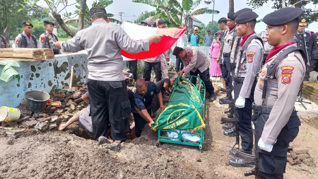 Kapolres Indramayu, AKBP Mochamad Fajar Gemilang, hadir langsung melaksanakan takziah dan memberikan penghormatan terakhir kepada anggotanya yang menjabat sebagai Bhabinkamtibmas Desa Langgensari Polsek Lelea tersebut, Kamis (2/4/2026).