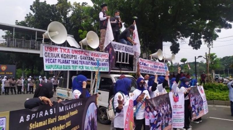 VISI.NEWS | JAKARTA – Massa aksi Gerakan Buruh Bersama Rakyat atau Gebrak tetap bertahan melanjutkan demonstrasi evaluasi 2 tahun kepemimpinan Joko Widodo – Maruf Amin meski hujan lebat menguyur kawasan Patung Kuda, Jakarta Pusat, Kamis (28/10/2021).