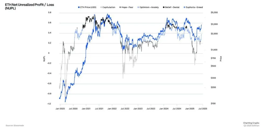 Earlier this year, Ethereum’s price experienced a sharp decline. According to Glassnode’s data, the NUPL dropped to around -0.2, signaling that a large portion of the market had entered capitulation a state where investors are overwhelmingly in loss.