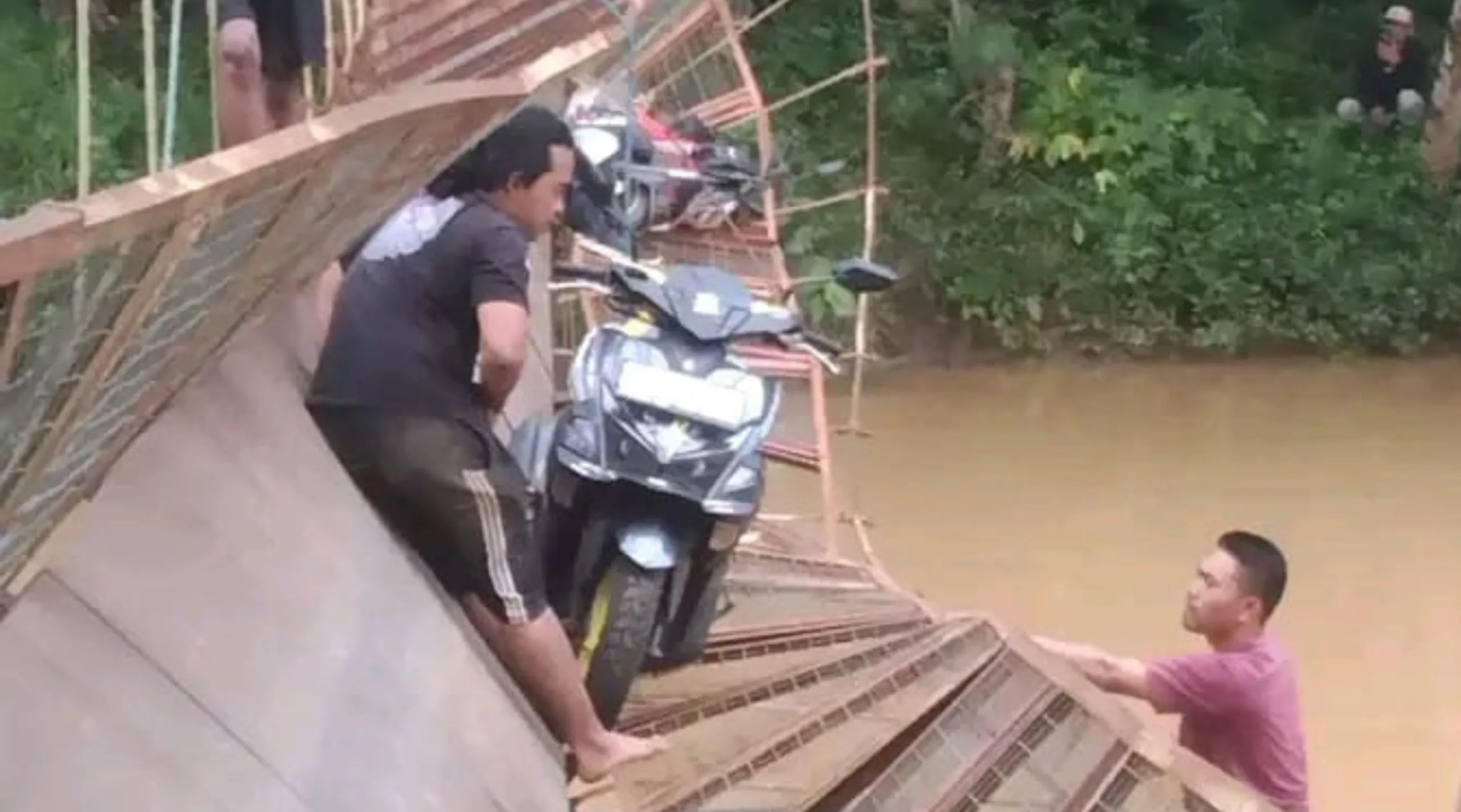 Peristiwa yang terjadi pada waktu pagi itu bermula ketika lima pengendara motor melintas bersamaan. Tiba-tiba, seling di salah satu sisi jembatan putus sehingga lima warga berikut kendaraannya terjatuh ke sungai.