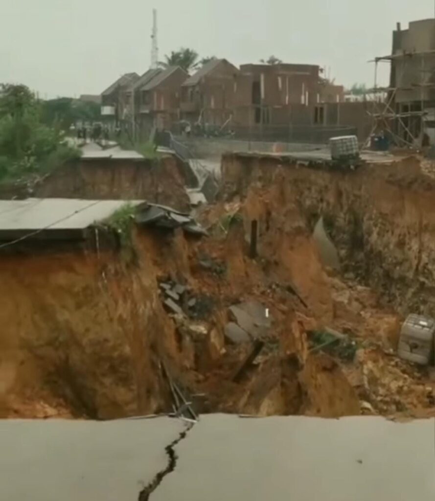 VISI.NEWS | TANGERANG – Bencana longsor terjadi di Jalan Rancahaur, Desa Karang Tengah, Kecamatan Pagedangan, Kabupaten Tangerang, Banten, Selasa (5/11/2024).
