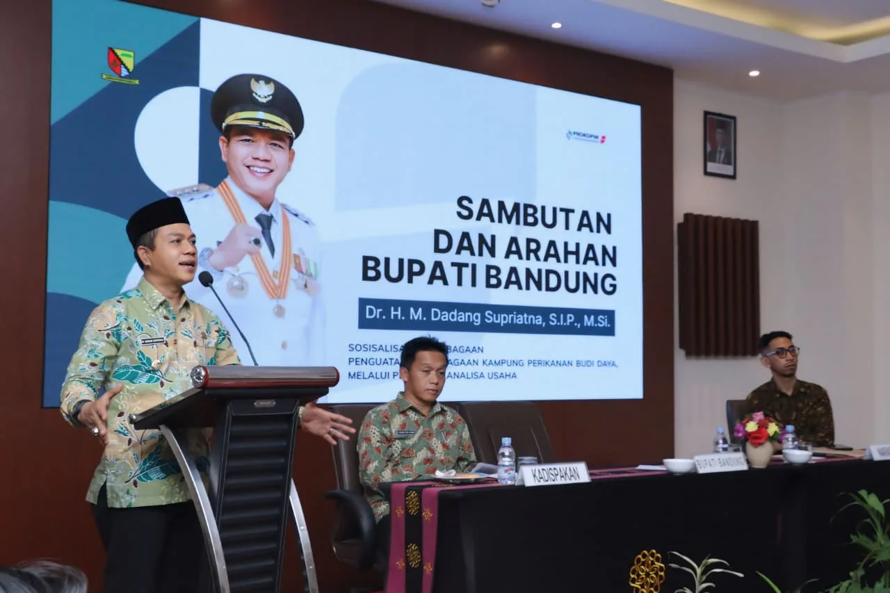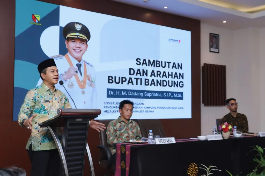 VISI.NEWS | KAB. BANDUNG – Bupati Bandung Dadang Supriatna menghadiri sekaligus membuka kegiatan sosialisasi kelembagaan dalam upaya penguatan kelembagaan kampung perikanan budidaya melalui pelatihan analisa usaha di Hotel Grand Sunshine, Kecamatan Soreang, Kabupaten Bandung, Kamis (25/9/2025).