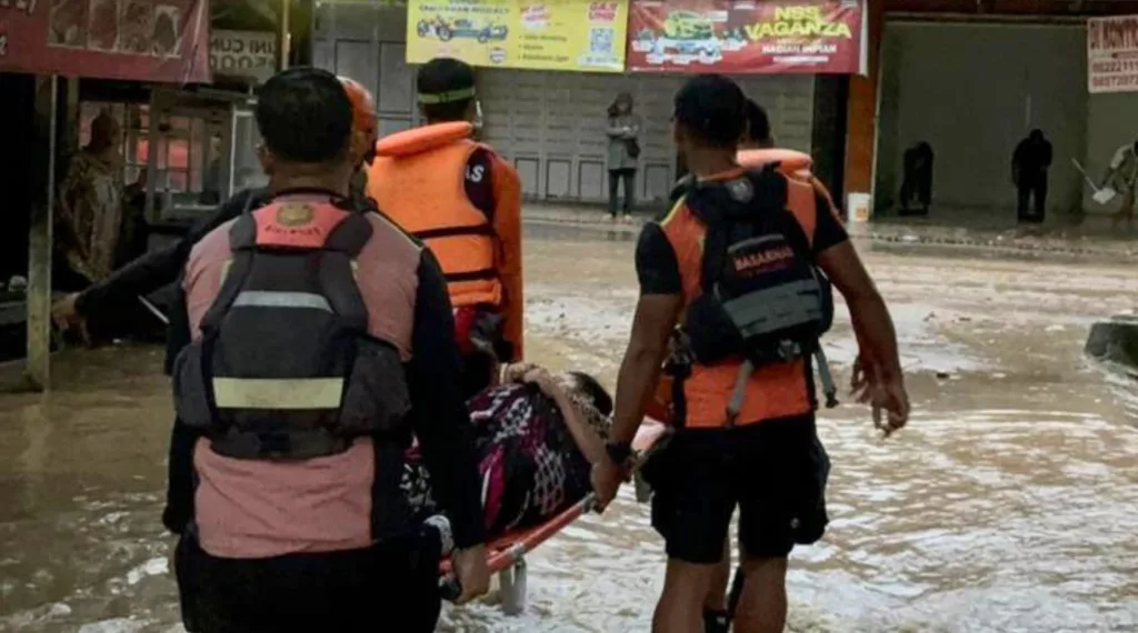 VISI.NEWS | SUKABUMI – Personil Pos SAR Sukabumi melakukan upaya penyelamatan dan evakuasi pasien serta tenaga kesehatan yang terjebak banjir saat berada di Puskesmas Palabuhanratu, Kabupaten Sukabumi.