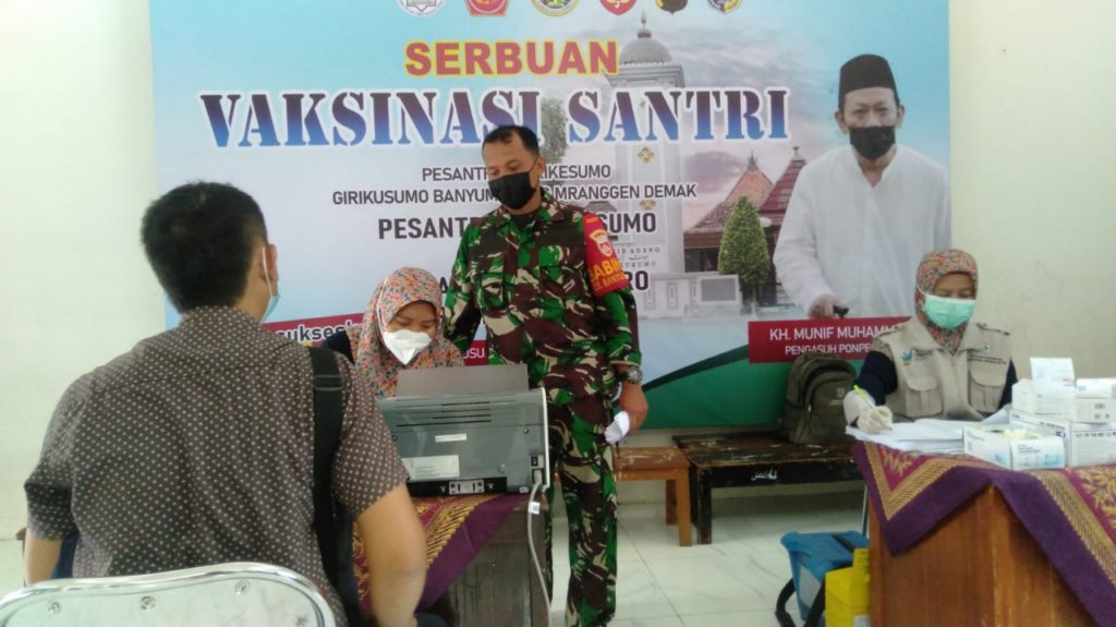 VISI.NEWS – Sebanyak 186 Jamaah Muji Nabi Asuhan KH Munif Muhammad Zuhri menerima Program vaksinasi. Di komplek Pondok Pesantren Giri Kusumo, Desa Banyumeneng, Kecamatan Mranggen, Senin (04/10/21). Vaksinasi terus digenjot pemerintah guna percepatan penanganan pandemi Covid-19.
