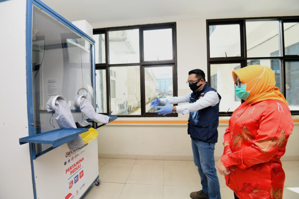 VISI.NEWS – Gubernur Jawa Barat (Jabar), Ridwan Kamil, didampingi Ketua TP PKK Provinsi Jabar, Atalia Ridwan Kamil, meninjau fasilitas layanan kesehatan di Rumah Sakit Umum Pusat (RSUP) Dr. Hasan Sadikin atau RSHS, Kota Bandung, Sabtu (30/5/20).